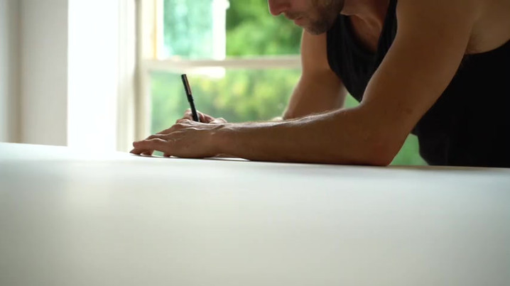 In der Werkserie Each Line One Breath verdichtet der Künstler den Akt des Zeichnens auf seinen elementarsten Ursprung: die eigene Existenz im Moment. Jede Linie entsteht im Rhythmus seines Atems. Mit dem Einatmen wird eine Linie gesetzt, mit dem Ausatmen folgt die nächste. Zeichnung und Körper sind dabei untrennbar miteinander verbunden – der physische Vorgang des Atmens wird zum strukturierenden Prinzip der Arbeit.
